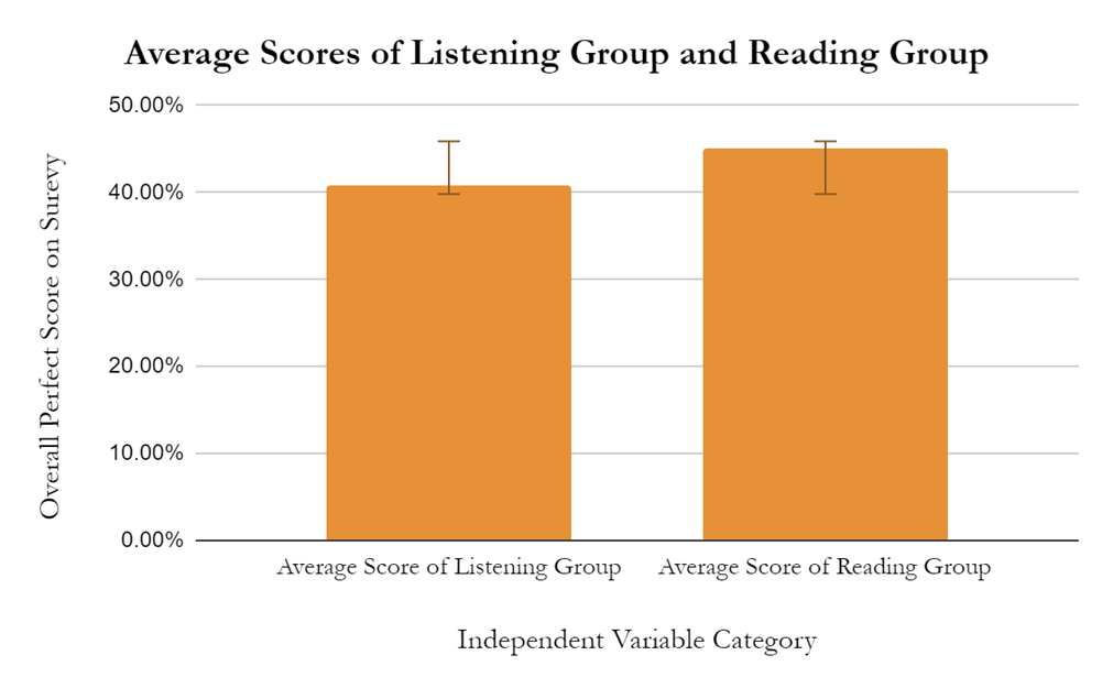 The reading group outperformed the listening group on the comprehension survey, supporting our hypothesis and aligning with prior literature on attention and modality-based learning.